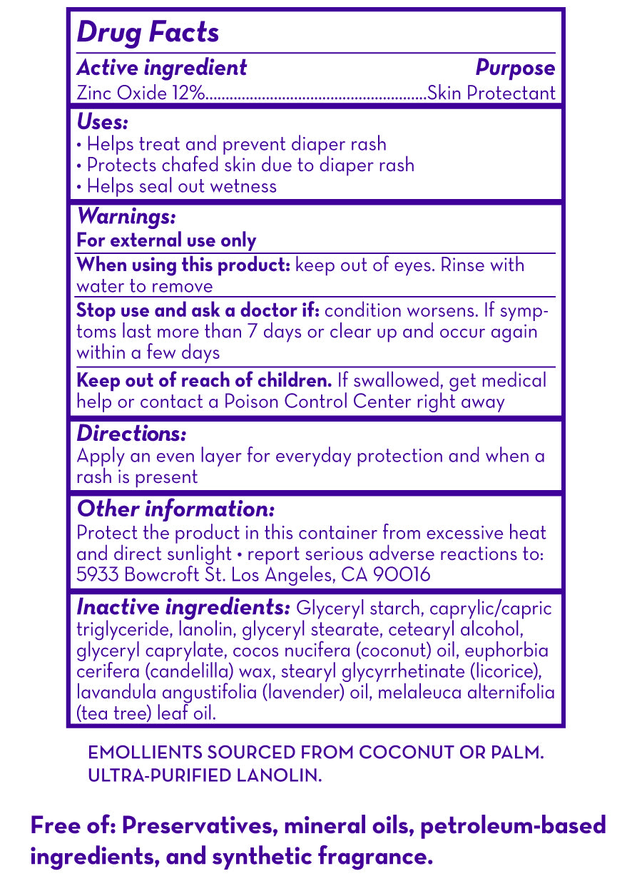 Vitamin-grade zinc oxide treats and prevents diaper rash while purified lanolin leaves a moisture barrier on the skin. Added coconut oil and licorice help soothe sore bottoms. Cloth-diaper safe.