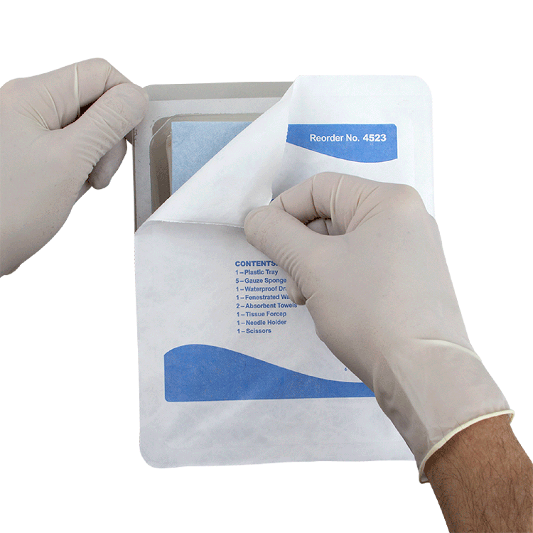 - Includes: (1) Plastic tray; (5) Gauze sponges; (1) Waterproof drape, blue; (1) Fenestrated waterproof drape; (2) Absorbent towels; (1) Tissue forceps; (1) Needle holder; (1) Scissors