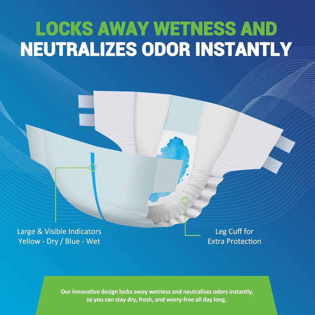 Engineered with heavy absorbency, they deliver comprehensive protection against total incontinence. The inclusion of leg cuffs provides an additional layer of safeguarding, while the ultra-absorbent core, featuring liquid lock technology, minimizes leaks and enhances containment.