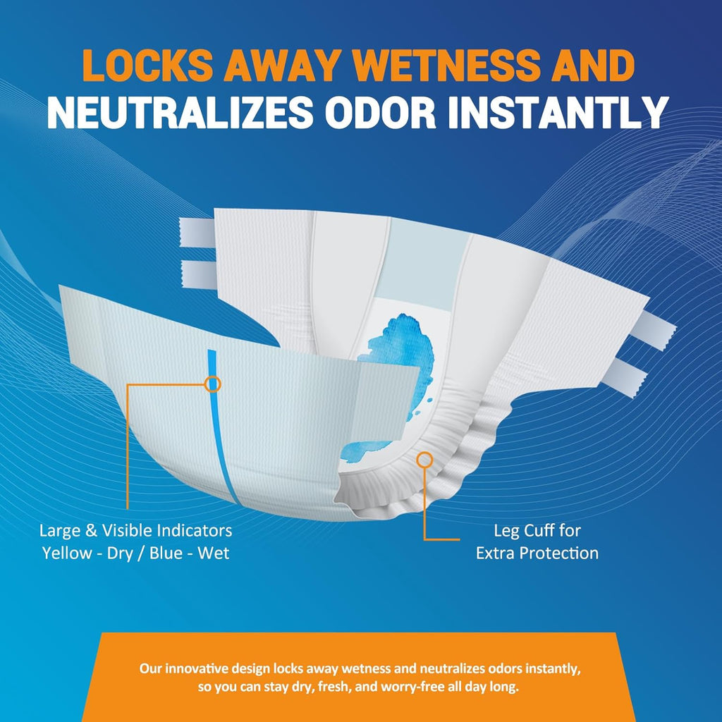 Engineered with heavy absorbency, they deliver comprehensive protection against total incontinence. The inclusion of leg cuffs provides an additional layer of safeguarding, while the ultra-absorbent core, featuring liquid lock technology, minimizes leaks and enhances containment.