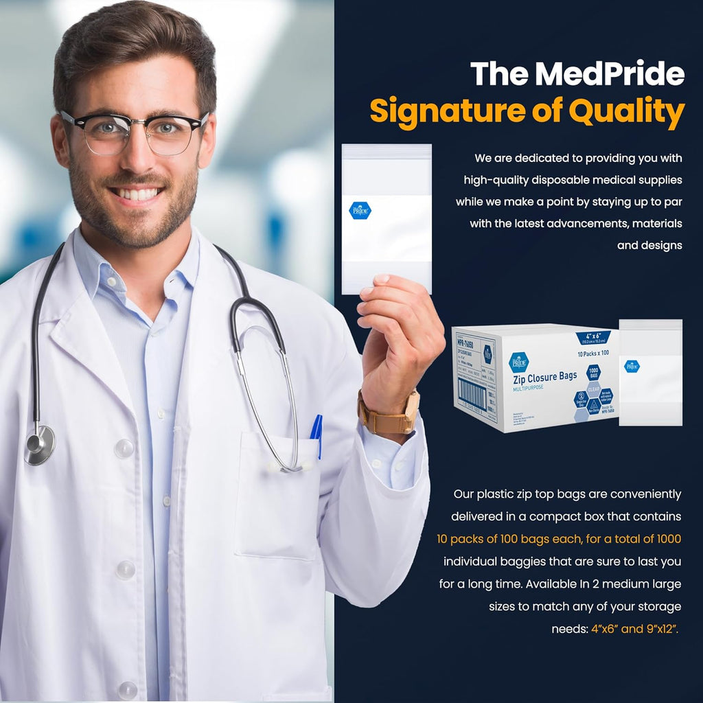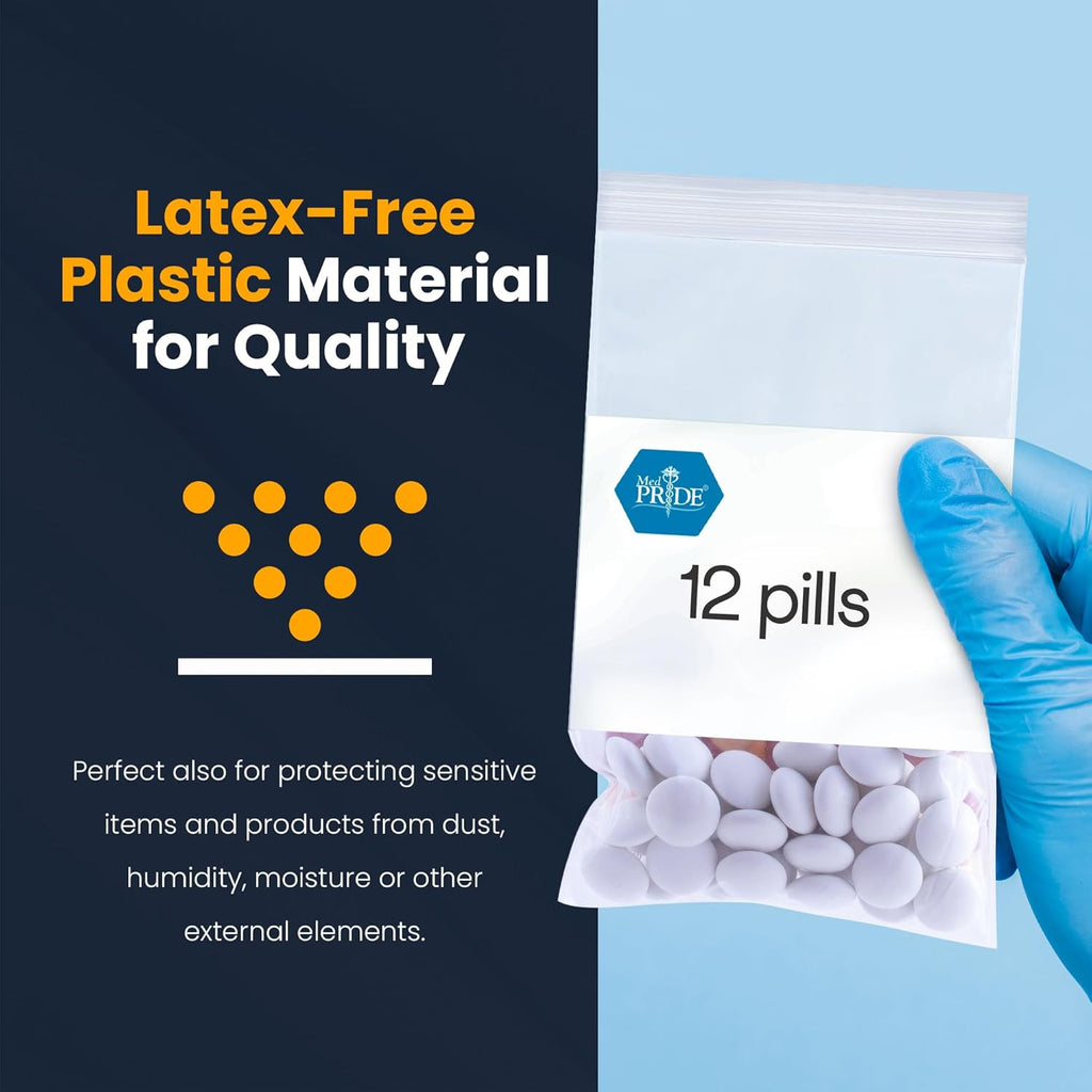 These reusable clear ziplock bags, size 4"x6" from MedPride are the perfect solution for safely storing a variety of items, including pills, medical supplies, jewelry, arts and crafts, pantry staples, office supplies, tech accessories, and travel essentials. Designed with a reclosable zip seal, they provide easy access while keeping your items secure and protected from dust, moisture, and spills.