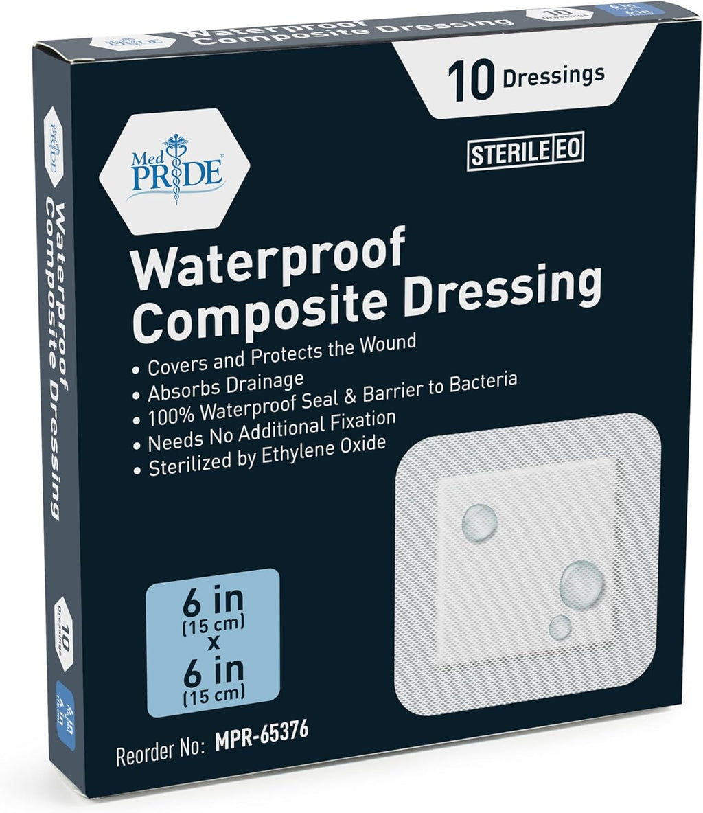 The MED PRIDE Waterproof Composite 6" x 6" Wound Dressing Pads are designed to provide optimal protection and comfort for a variety of wounds. Each pad is made from high-quality, sterile composite material that helps maintain a moist healing environment while preventing contamination.